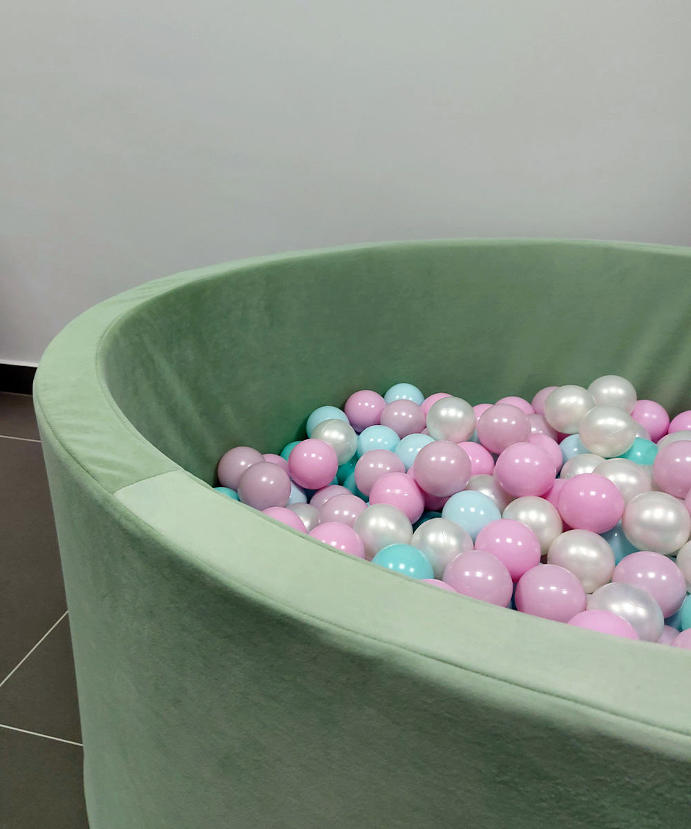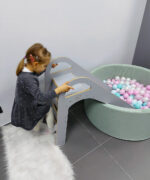 Piscina cu bile realizată din spumă poliuretanică de către Story Room  are multiple opțiuni de culoare și formă, oferă combinații nesfârșite, ușor de încadrat în camera oricărui copil.