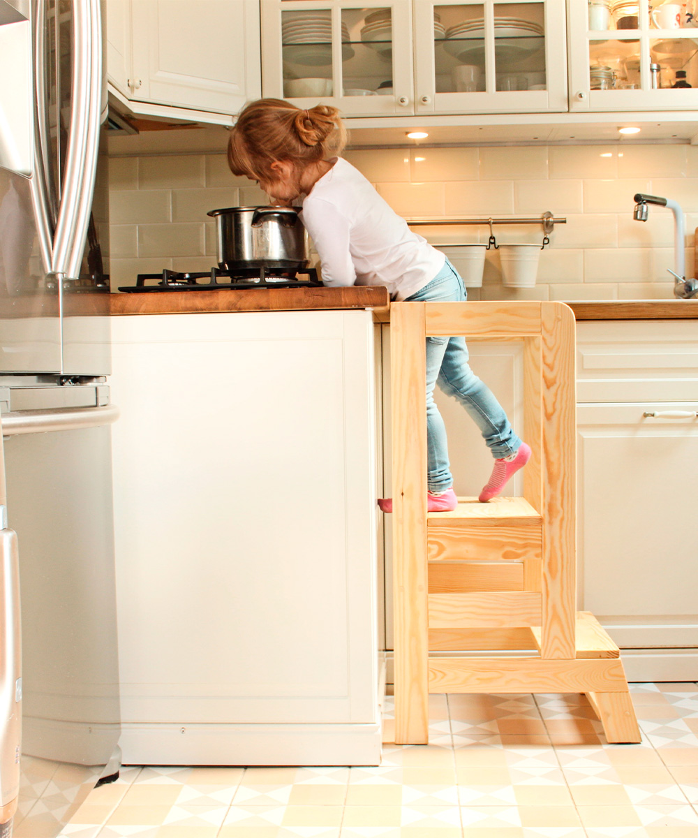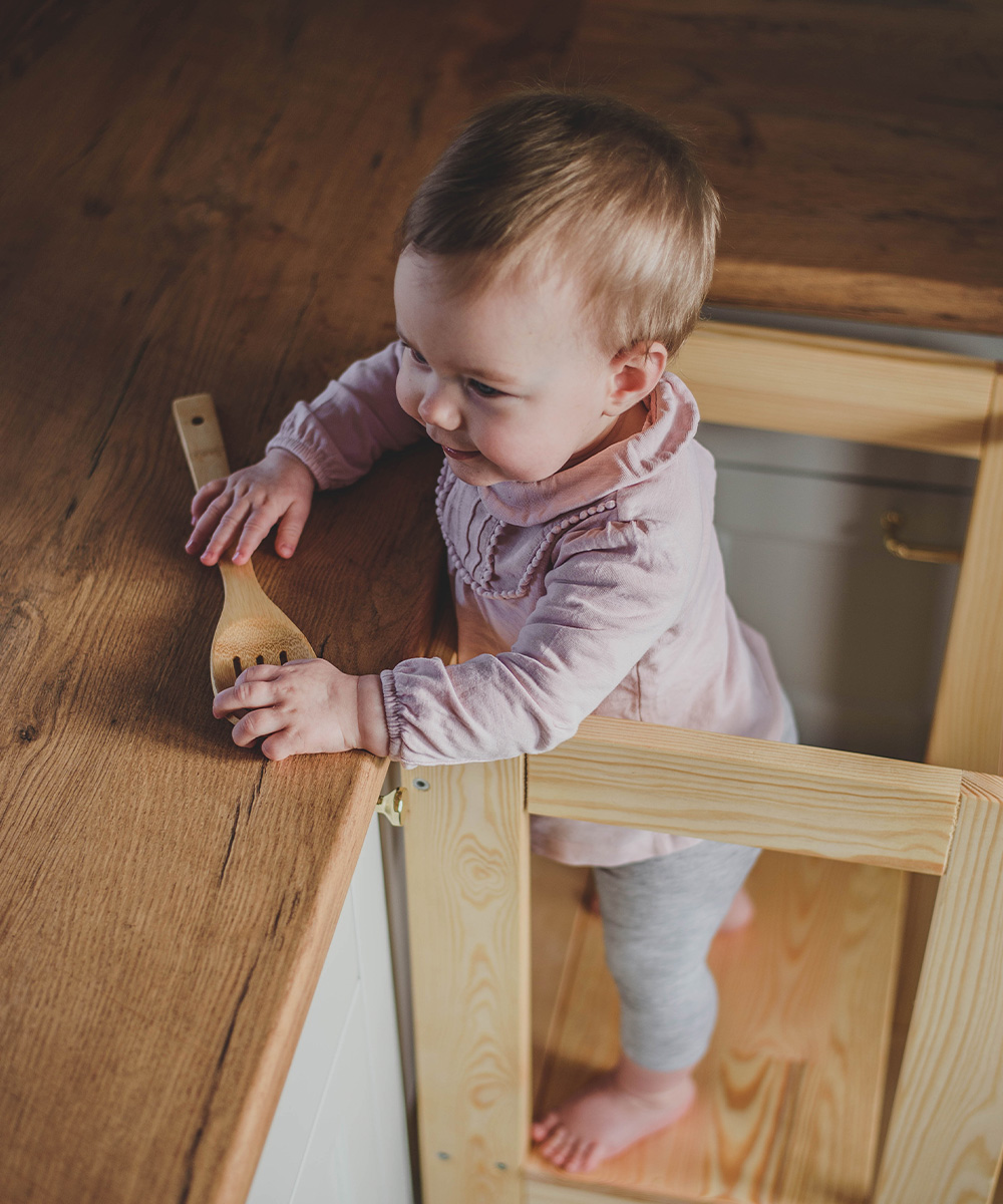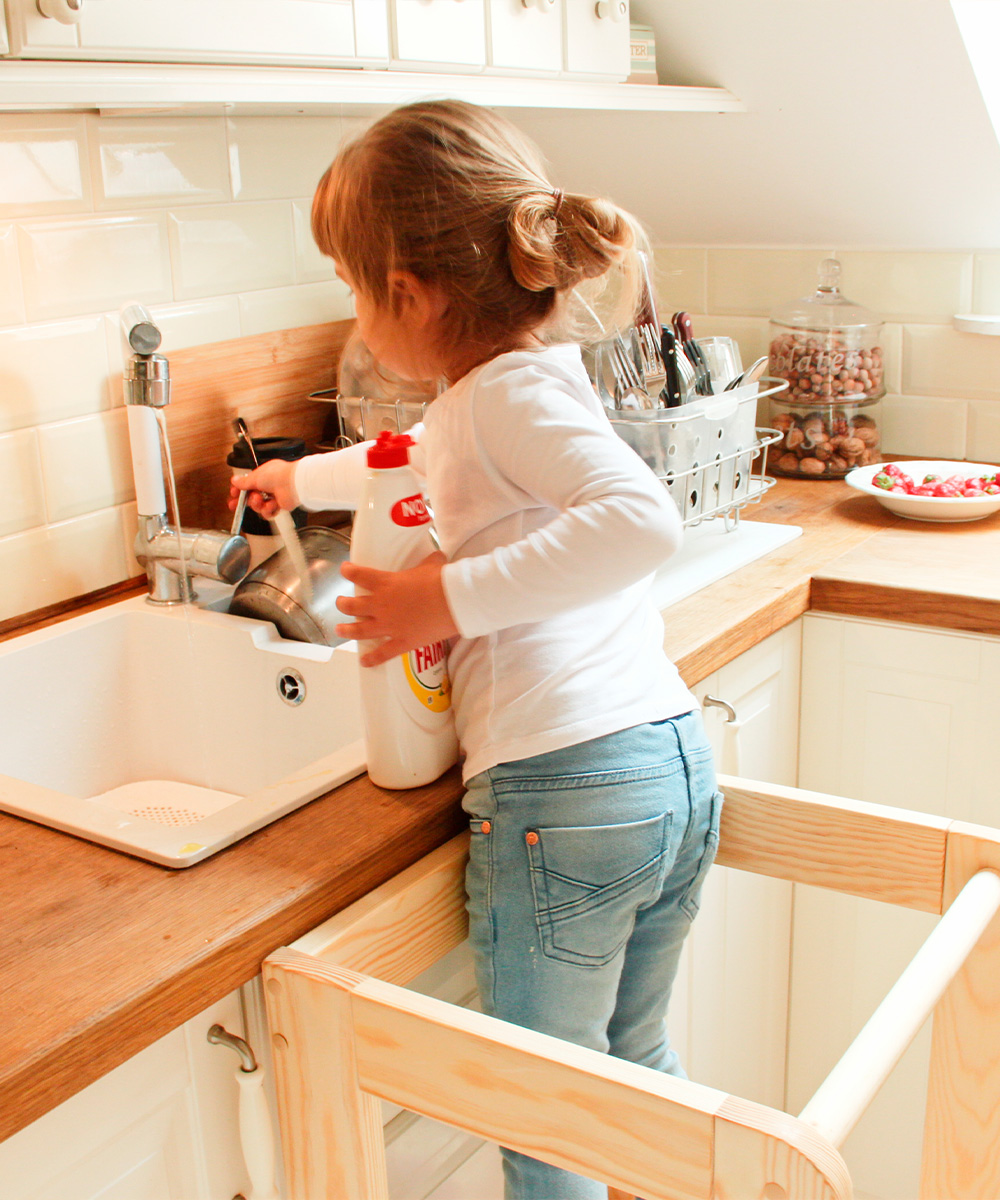 De obicei, copiii au acces limitat la un blat de bucătărie, chiuvetă sau masă. Cu Turnul Montessori, copilul participă activ la pregătirea vaselor, la acoperirea mesei, la spălarea vaselor, la aranjarea hainelor pe uscătorul de rufe.